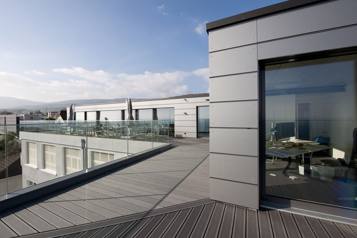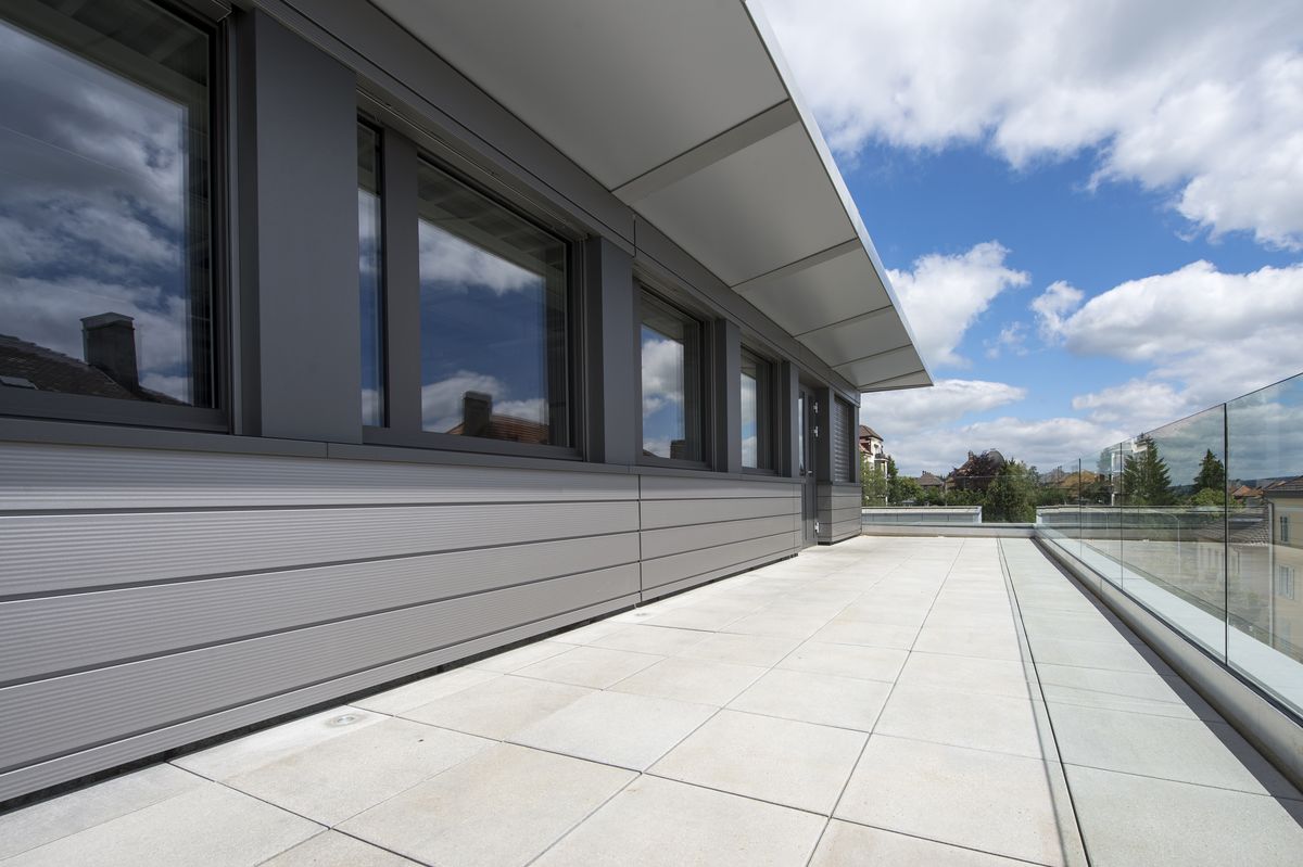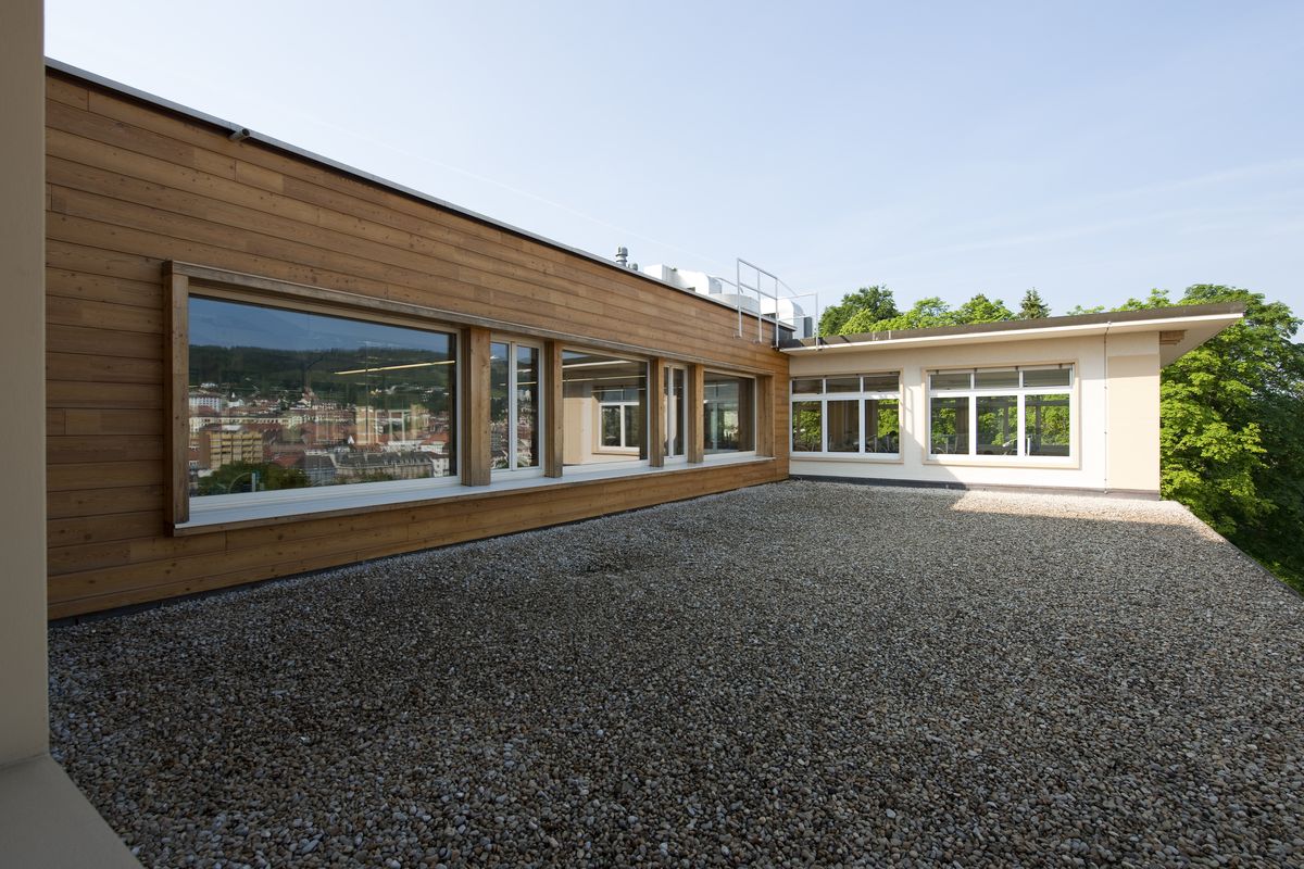 Surélévation du bâtiment en attique et de la cage d’escalier avec capteurs solaires photovoltaïques en toiture