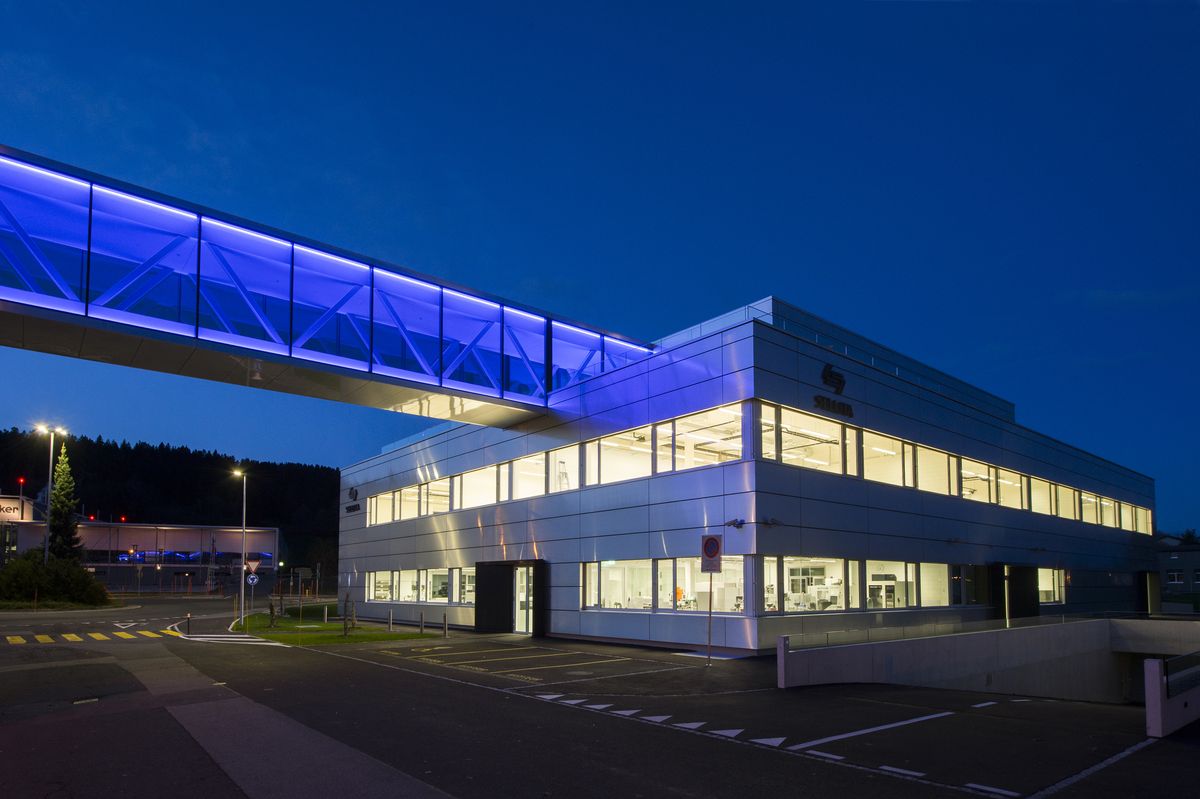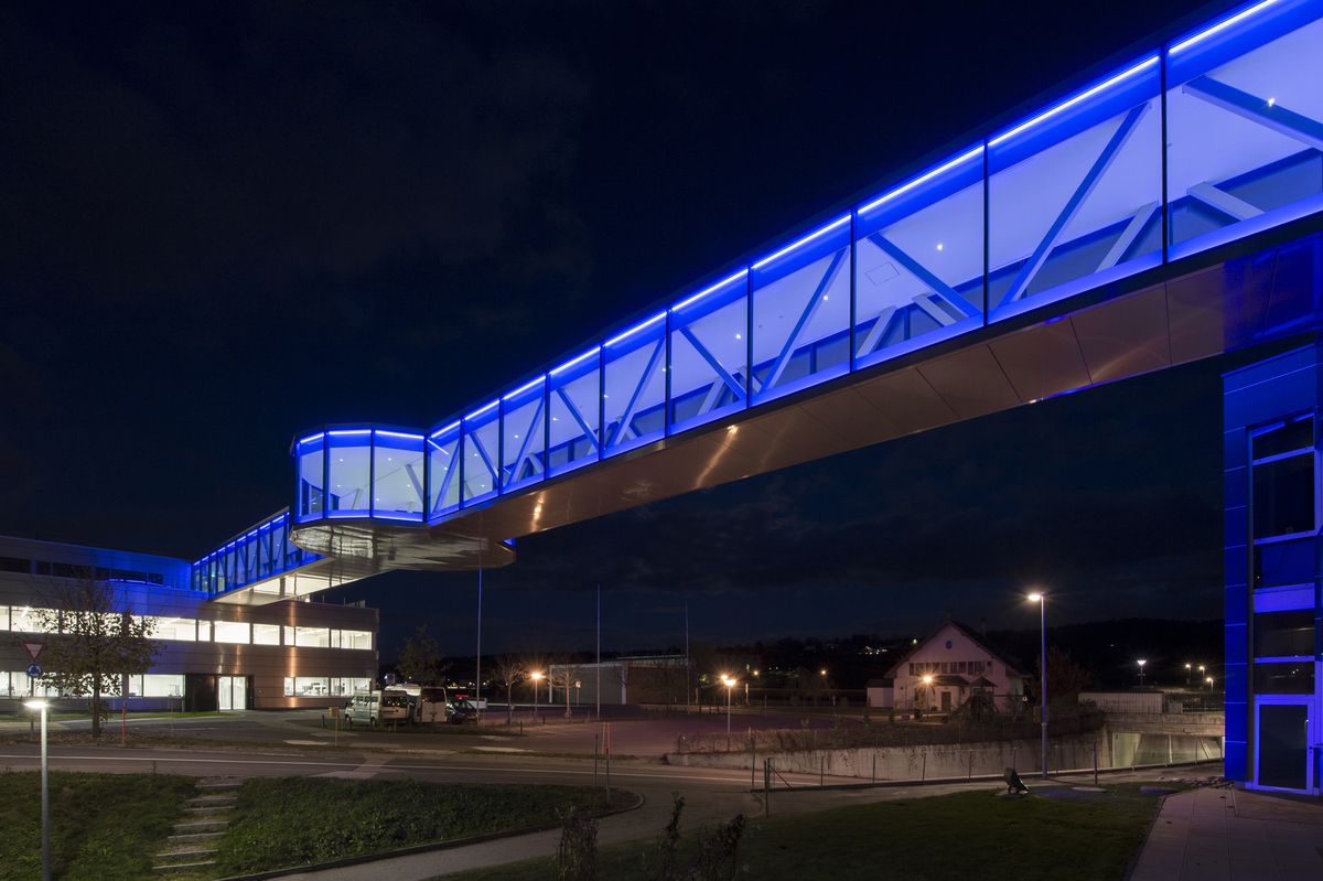 Construction d'une nouvelle passerelle de liaison, avec 65m de portée libre, en collaboration avec le bureau d'ingénieurs civils GVH La Chaux-de-Fonds SA et Stephen SA